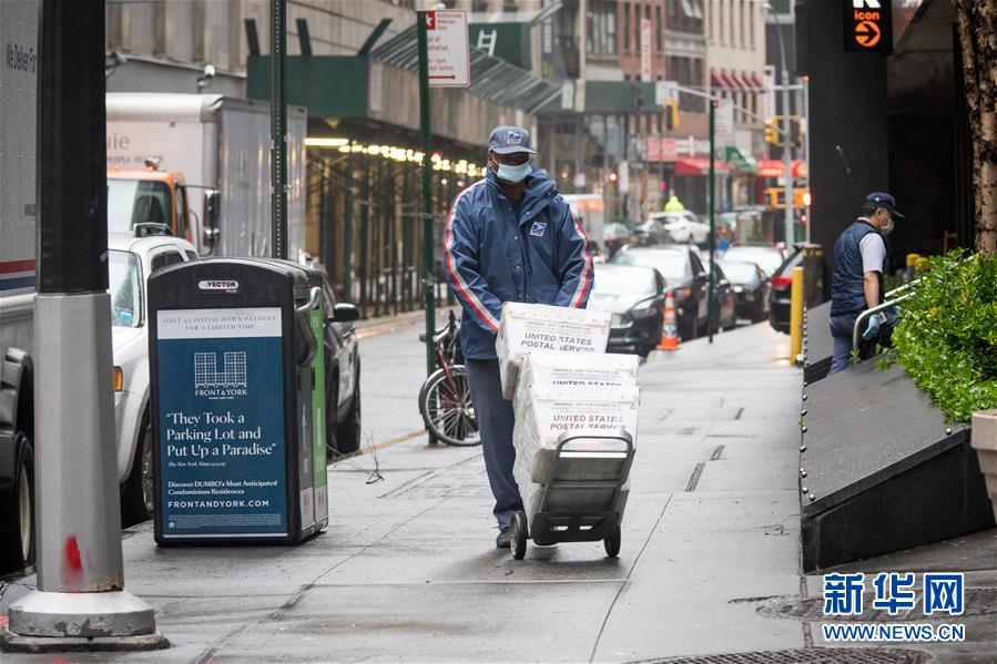 4月13日,在美国纽约,一名邮递员佩戴口罩工作。 纽约州州长科莫12日签署行政命令,要求从15日晚间开始,纽约州所有关键行业员工在上班期间与公众接触都必须佩戴口罩,其口罩由雇主提供。 新华社发 (郭克摄)