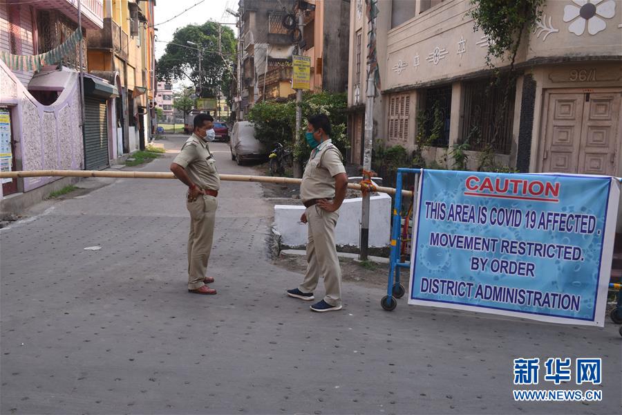 4月13日,在印度加尔各答,警察在一处被封锁的区域外值勤。新华社发
