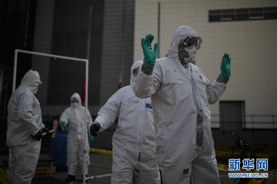 4月13日,在哥伦比亚波哥大,身着防护服的工作人员在建筑物附近清洁消毒。 哥伦比亚政府已将全国强制预防性居家隔离政策延长至4月26日23时59分,学校继续停课至5月末。 新华社发(约翰·帕斯摄)