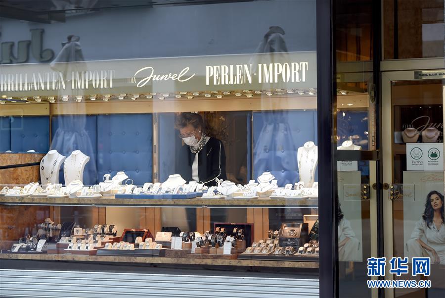 这是4月14日在奥地利首都维也纳的格拉本大街拍摄的重新营业的商店。 奥地利卫生部长安朔贝尔13日说,奥地利从14日起将进入“局部安全放开”的抗疫第二阶段,营业面积不超过400平方米的小型商店、修车厂、建材园艺市场等可恢复营业,店员和顾客须严格遵守佩戴口罩、保持距离等规定。 新华社记者 郭晨 摄