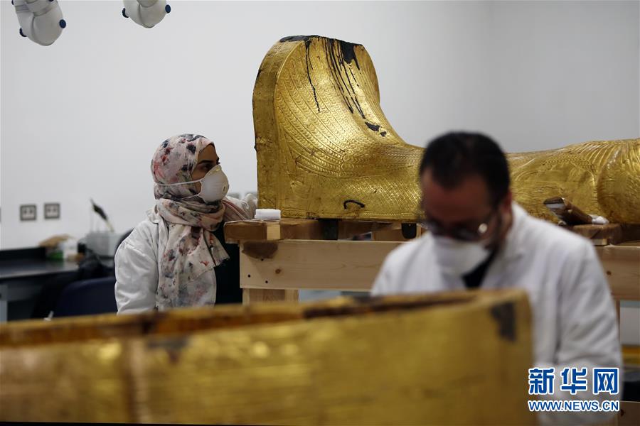 4月13日,在位于埃及吉萨的大埃及博物馆文物修复实验室,戴口罩的工作人员对图坦卡蒙的金棺进行修复。新华社发(艾哈迈德·戈马摄)