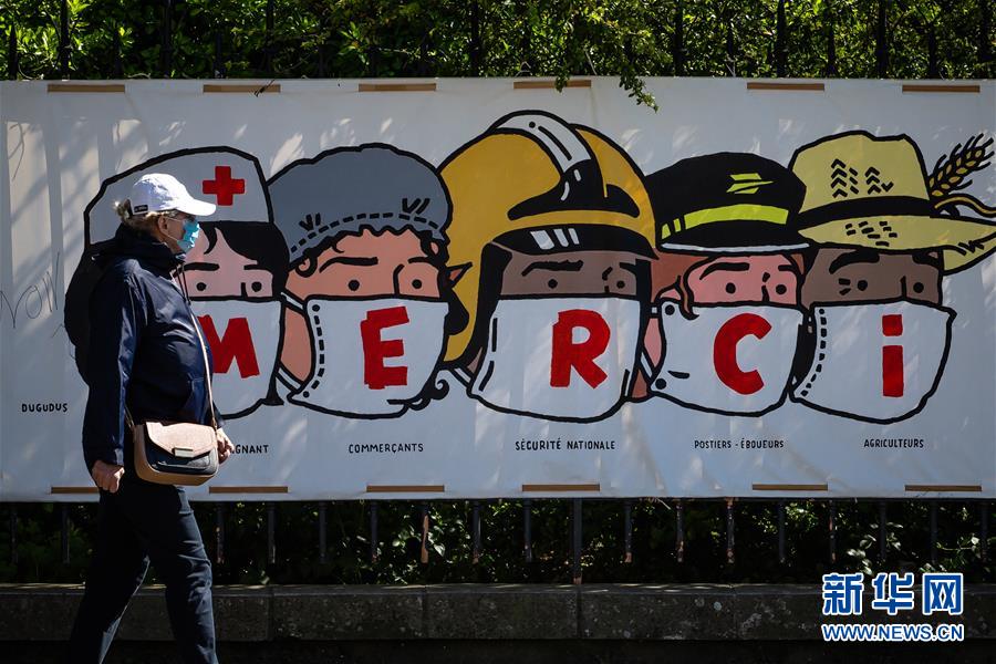 4月14日,在法国巴黎,一名男子走过一幅向疫情期间辛苦付出的人们致谢的海报。 法国总统马克龙13日晚发表电视讲话说,为防控新冠疫情而实施的“禁足令”将延长至5月11日。此后,法国将对部分防控举措进行调整。 新华社发(奥雷利安·莫里萨尔 摄)