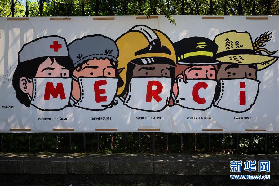 这是4月14日在法国巴黎街头拍摄的一幅向疫情期间辛苦付出的人们致谢的海报。 法国总统马克龙13日晚发表电视讲话说,为防控新冠疫情而实施的“禁足令”将延长至5月11日。此后,法国将对部分防控举措进行调整。 新华社发(奥雷利安·莫里萨尔 摄)
