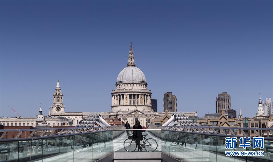 4月14日,一名女子在英国伦敦的千禧桥上驻足,眺望远处的圣保罗大教堂。新华社记者 韩岩 摄