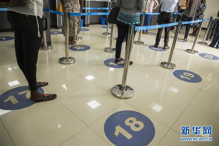 4月15日,在卢旺达首都基加利,一家银行地面设置了保持社交距离的提示。新华社发(西里尔·恩德格亚摄)