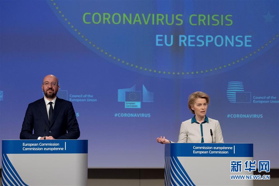 4月15日,在比利时布鲁塞尔的欧盟总部,欧洲理事会主席米歇尔(左)和欧盟委员会主席冯德莱恩出席新闻发布会。 欧洲理事会主席米歇尔和欧盟委员会主席冯德莱恩15日共同提出一份“欧盟路线图”,表示欧盟各成员国在取消为防控新冠疫情而采取的限制性措施过程中要相互协调、循序渐进。 新华社发