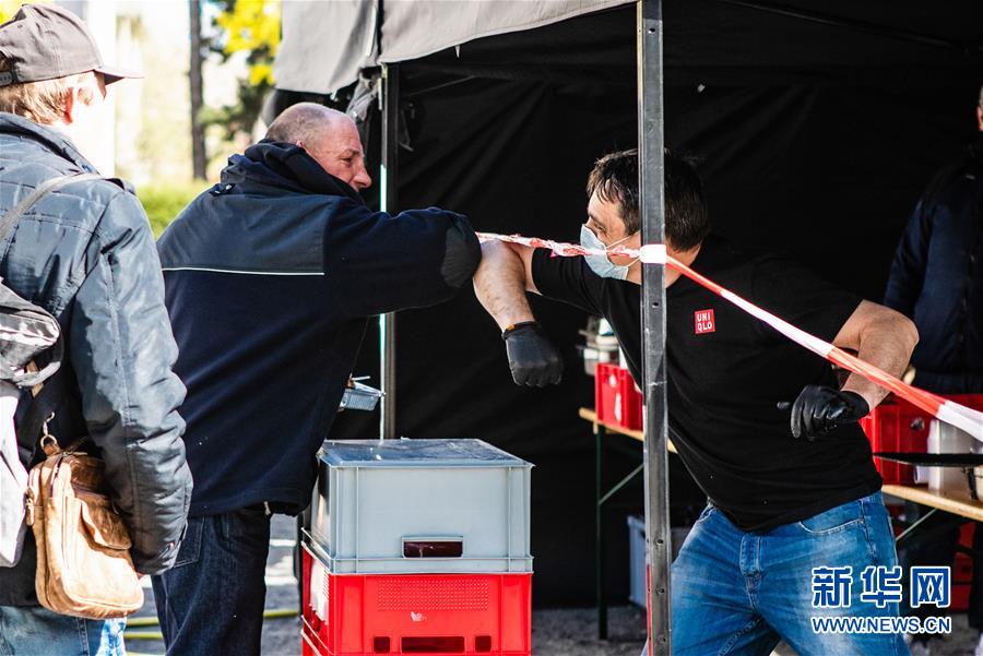 4月16日,在德国首都柏林,一家餐饮公司的工作人员(右)与前来领取免费食物的男子“碰肘”问候。 新冠疫情期间,德国不少团体和个人对有需要的群体伸出援助之手。 新华社发(张平摄)