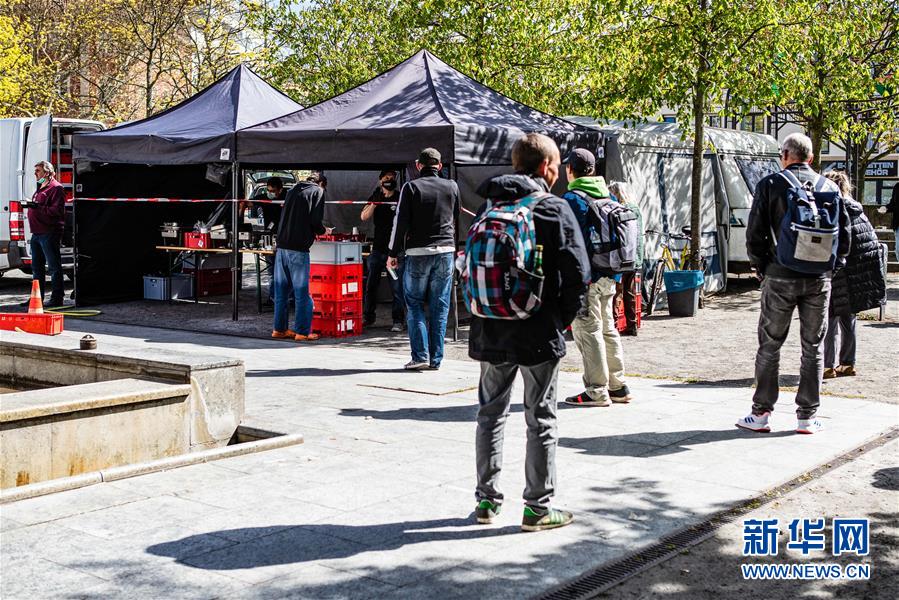 4月16日,在德国首都柏林,人们排队等候领取免费食物。 新冠疫情期间,德国不少团体和个人对有需要的群体伸出援助之手。 新华社发(张平摄)