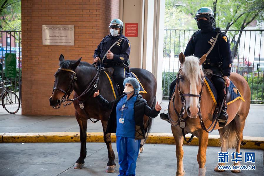 4月16日傍晚,在美国纽约一家医院外,一名医护人员与前来表达敬意的骑警合影。 新冠疫情之下,美国纽约民众每晚7点左右自发以鼓掌、喝彩等方式向医护、邮政、公交等“关键行业”人员致敬,感谢他们冒着风险坚持为社会服务。之所以选择每晚7点,是因为医护人员通常在这个时段交接班。 新华社发 (郭克摄)