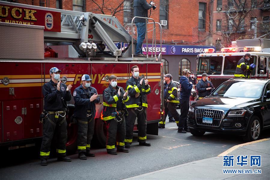 4月16日傍晚,人们聚集在美国纽约一家医院外,向抗击疫情的医护人员表达敬意。 新冠疫情之下,美国纽约民众每晚7点左右自发以鼓掌、喝彩等方式向医护、邮政、公交等“关键行业”人员致敬,感谢他们冒着风险坚持为社会服务。之所以选择每晚7点,是因为医护人员通常在这个时段交接班。 新华社发 (郭克摄)