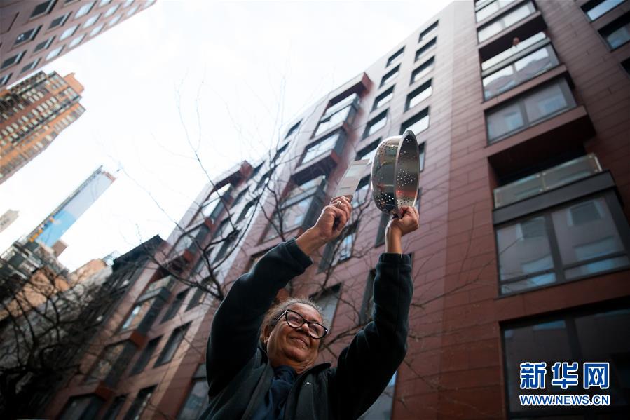 4月16日傍晚,一名居民在美国纽约一家医院对面向抗击疫情的医护人员表达敬意。 新冠疫情之下,美国纽约民众每晚7点左右自发以鼓掌、喝彩等方式向医护、邮政、公交等“关键行业”人员致敬,感谢他们冒着风险坚持为社会服务。之所以选择每晚7点,是因为医护人员通常在这个时段交接班。 新华社发 (郭克摄)