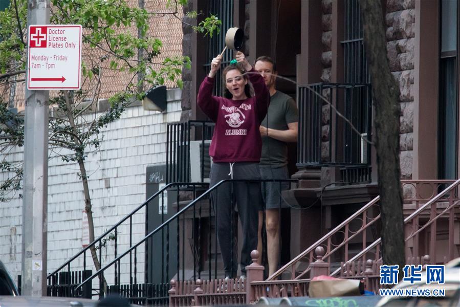 4月16日傍晚,一名居民在美国纽约一家医院对面的住宅外向抗击疫情的医护人员表达敬意。 新冠疫情之下,美国纽约民众每晚7点左右自发以鼓掌、喝彩等方式向医护、邮政、公交等“关键行业”人员致敬,感谢他们冒着风险坚持为社会服务。之所以选择每晚7点,是因为医护人员通常在这个时段交接班。 新华社发 (郭克摄)
