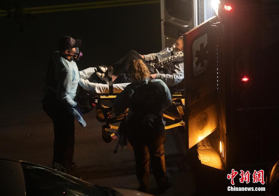 当地时间4月7日,旧金山湾区密尔布雷市一位戴上呼吸面罩的老人被医护人员抬上救护车。中新社记者 刘关关 摄