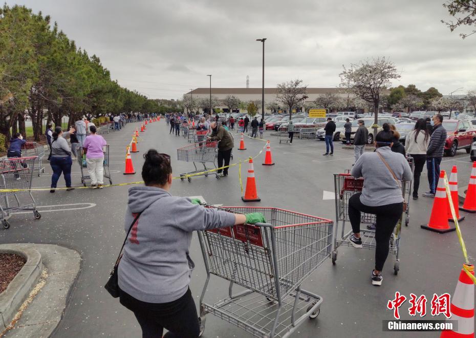 当地时间4月8日,美国旧金山湾区民众在位于福斯特城的Costco超市外排起长队,等候购买物资。中新社记者 刘关关 摄