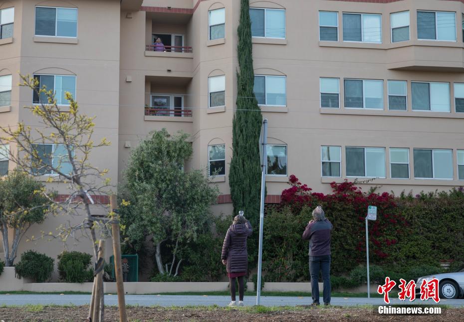 当地时间4月12日,正值美国重要节日复活节,旧金山湾区密尔布雷市居民罗德(右)和卡兰站在母亲的公寓下,拿着空酒杯向母亲“敬酒”。罗德说,往年,全家人都会聚在一起过复活节,而今年大家都要遵守“社交距离”的规定,他们夫妻俩因此来到母亲的阳台外,“隔空”祝母亲节日快乐。中新社记者 刘关关 摄