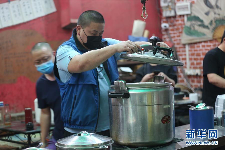 4月12日,在尼泊尔首都加德满都的旅游集散地泰米尔,中华面馆的老板李亮在厨房准备餐食。新华社记者 周盛平 摄