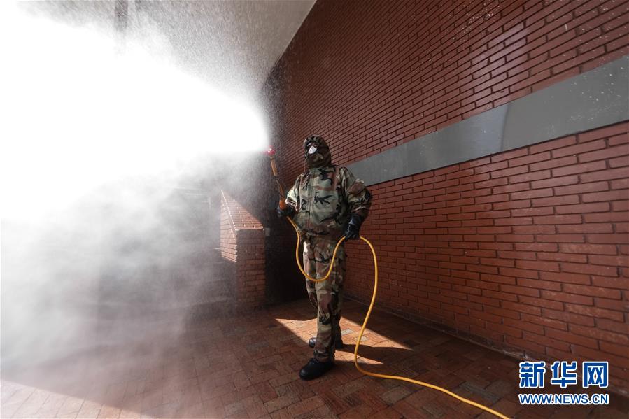 4月16日,在哥伦比亚波哥大,军方人员进行消毒工作。新华社发(约翰·帕斯摄)