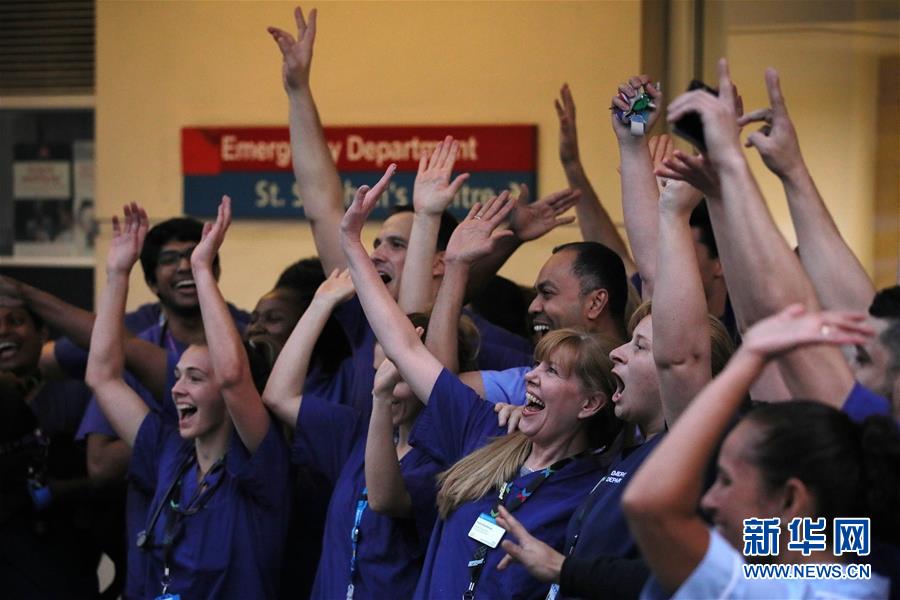 4月16日晚,在英国伦敦,医护人员在切尔西和威斯敏斯特医院前接受人们的掌声,也为同行鼓掌致敬。 新冠疫情期间,每到周四晚八时,英国民众在阳台、门前或窗前鼓掌,表达对抗击新冠疫情的医护人员的敬意。 新华社发(蒂姆·爱尔兰摄)