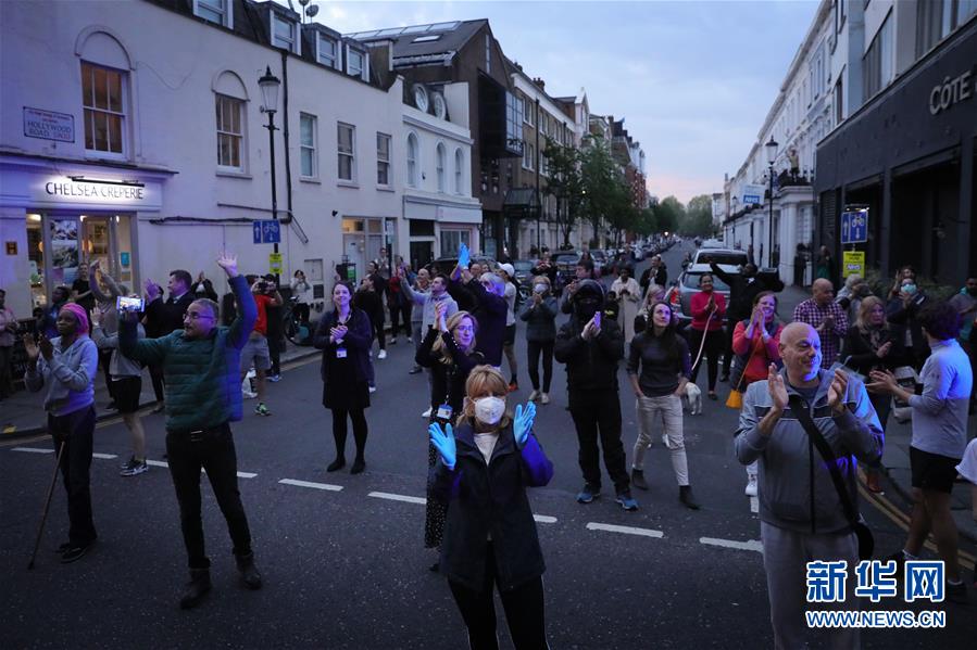 4月16日晚,在英国伦敦,人们在切尔西和威斯敏斯特医院外向医护人员鼓掌致敬。 新冠疫情期间,每到周四晚八时,英国民众在阳台、门前或窗前鼓掌,表达对抗击新冠疫情的医护人员的敬意。 新华社发(蒂姆·爱尔兰摄)