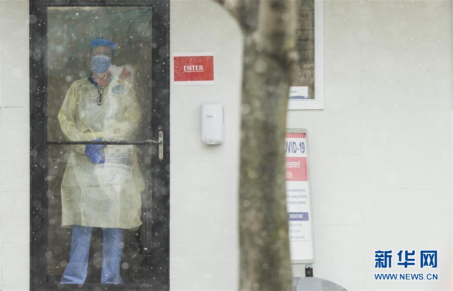 4月16日,在加拿大多伦多的一处新冠病毒检测中心,医护人员在工作间隙望向门外飘落的雪花。新华社发(邹峥摄)