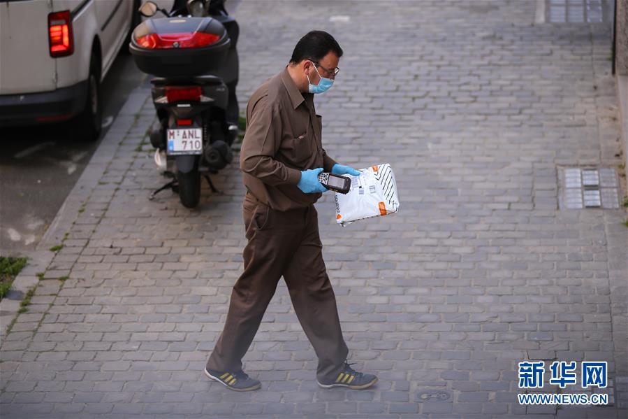 4月17日,在比利时布鲁塞尔,一名快递员在送快件。 受新冠疫情影响,比利时从3月18日12时起全国范围内实施“封城”,目前封禁措施已延长至5月3日。截至4月17日,比利时累计确诊病例36138例。 新华社记者 张铖 摄