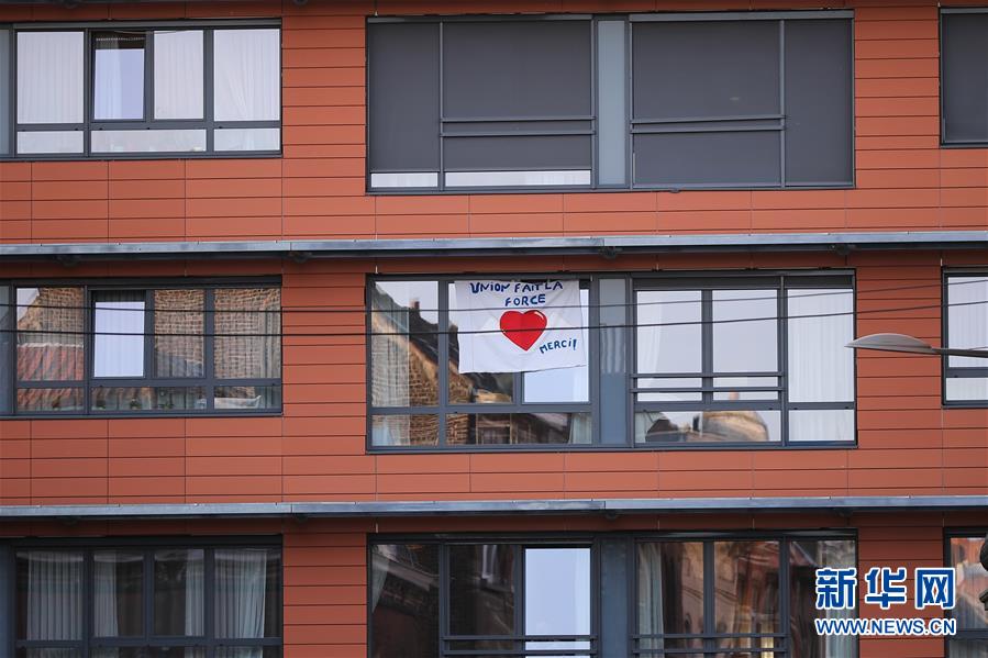 4月17日,在比利时布鲁塞尔,一户居民窗口挂出了印有”团结就是力量”标语的旗帜。 受新冠疫情影响,比利时从3月18日12时起全国范围内实施“封城”,目前封禁措施已延长至5月3日。截至4月17日,比利时累计确诊病例36138例。 新华社记者 张铖 摄