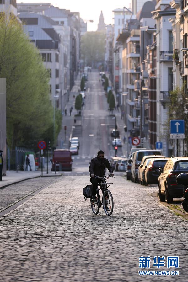 4月17日,在比利时布鲁塞尔,一名男子在空荡的街道上骑车。 受新冠疫情影响,比利时从3月18日12时起全国范围内实施“封城”,目前封禁措施已延长至5月3日。截至4月17日,比利时累计确诊病例36138例。 新华社记者 张铖 摄