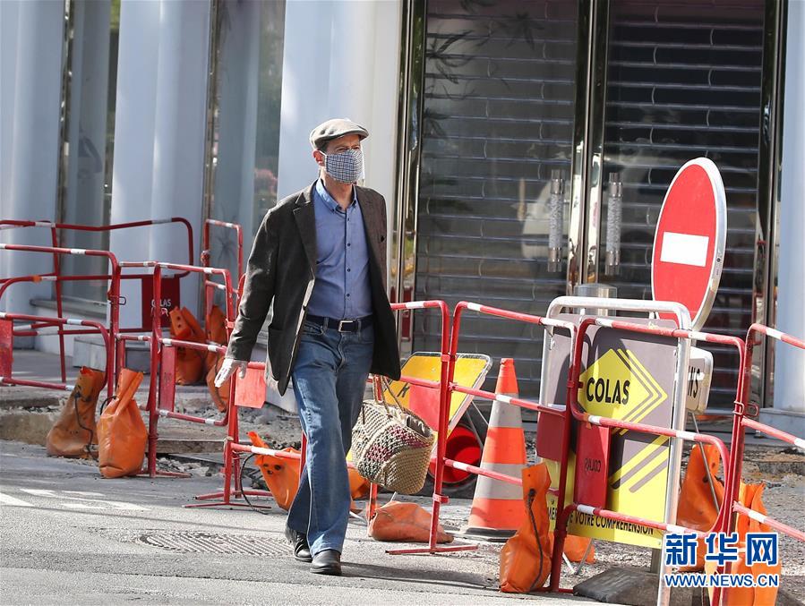 4月18日,在法国南部城市戛纳,一名男子戴着口罩和手套出行。新华社发(塞尔热·阿乌兹摄)
