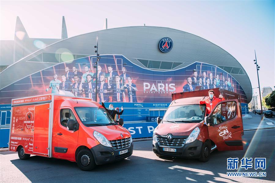 4月15日,为医护人员送餐的车辆停在法国巴黎王子球场前。新华社发(巴黎圣日耳曼俱乐部供图)