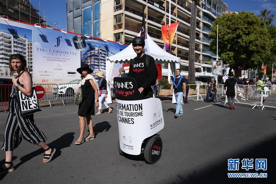 这张2019年5月13日拍摄的资料照片显示,在法国戛纳,当地旅游局的工作人员在电影节开幕前上街宣传。 新华社记者高静摄