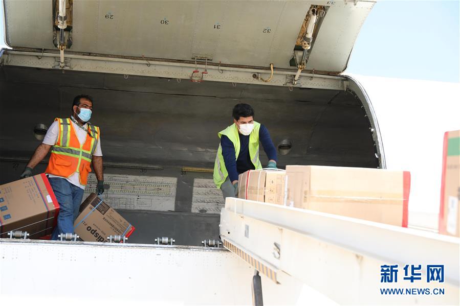 4月20日,工作人员在伊拉克巴格达国际机场搬运中方援助的防疫物资。 新华社发