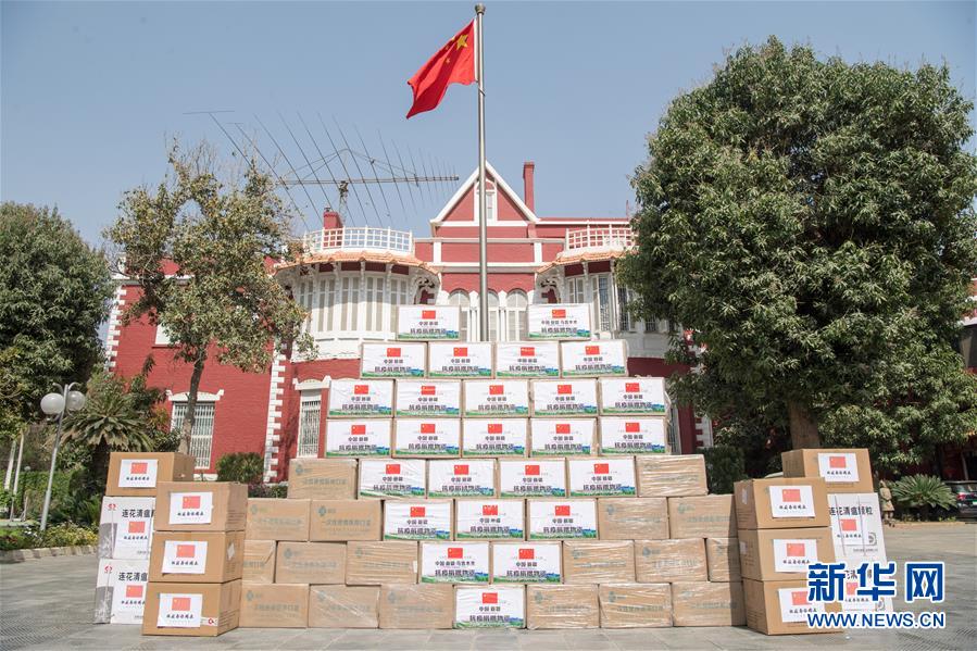 这是4月20日在埃及首都开罗中国驻埃及大使馆内拍摄的防疫物品。 新华社记者 邬惠我 摄