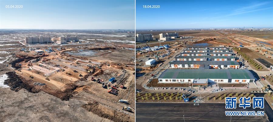 拼版照片:左图为4月5日拍摄的努尔苏丹市应急传染病医院建设工地。右图为4月18日拍摄的努尔苏丹市应急传染病医院建设工地。 新华社发