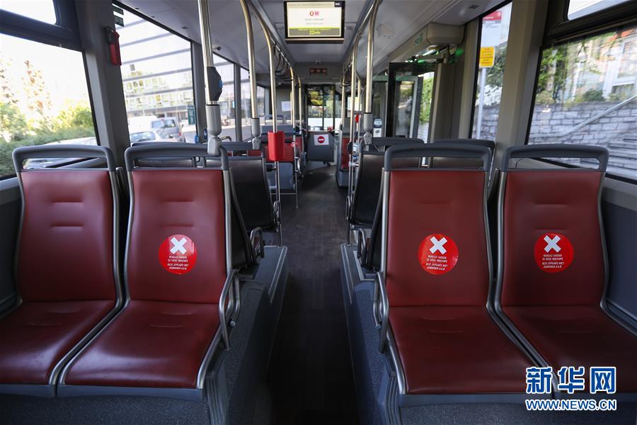 这是4月21日在比利时布鲁塞尔的公交车上拍摄的禁止人们近距离就坐的标识。 比利时国家公共卫生研究所21日发布公报说,比利时新冠肺炎确诊病例累计已达40956例。 新华社记者 郑焕松 摄