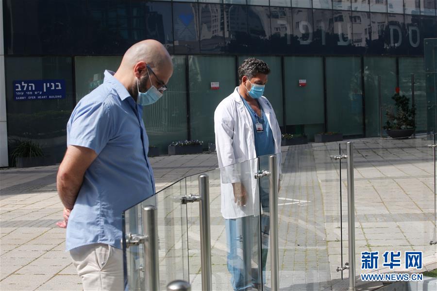 4月21日,在以色列特拉维夫的苏拉斯基医疗中心,医护工作者参加默哀活动,悼念第二次世界大战中的犹太人死难者。 一年一度的以色列大屠杀纪念日根据犹太历法确定,今年的纪念日从4月20日日落开始,至21日日落结束。 新华社发(吉尔·科恩·马根 摄)