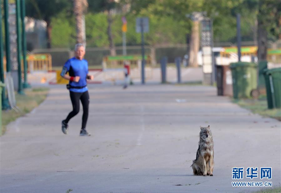 4月12日,在以色列特拉维夫市中心,一只豺坐在离一名健身者不远的道路上。为应对新冠疫情,特拉维夫市民们纷纷减少外出,市内道路大部分时间空空荡荡。 新华社/基尼图片社