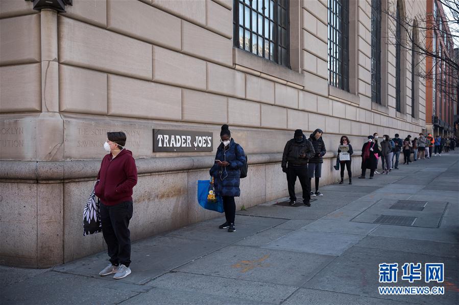 3月26日,在美国纽约布鲁克林,人们间隔排队等待进入超市购物。当日,美国约翰斯·霍普金斯大学发布的数据显示,截至美国东部时间26日18时,美国成为全球新冠确诊病例最多的国家。 新华社发(郭克摄)