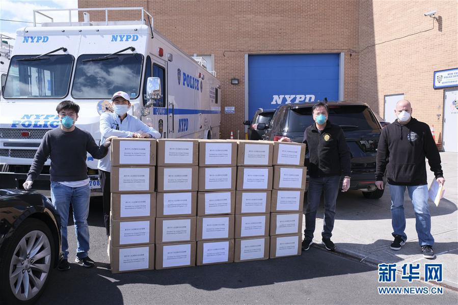 4月1日,在美国纽约,志愿者将美东华人社团联合总会捐赠的3万个口罩送到纽约警察总局。 新华社发