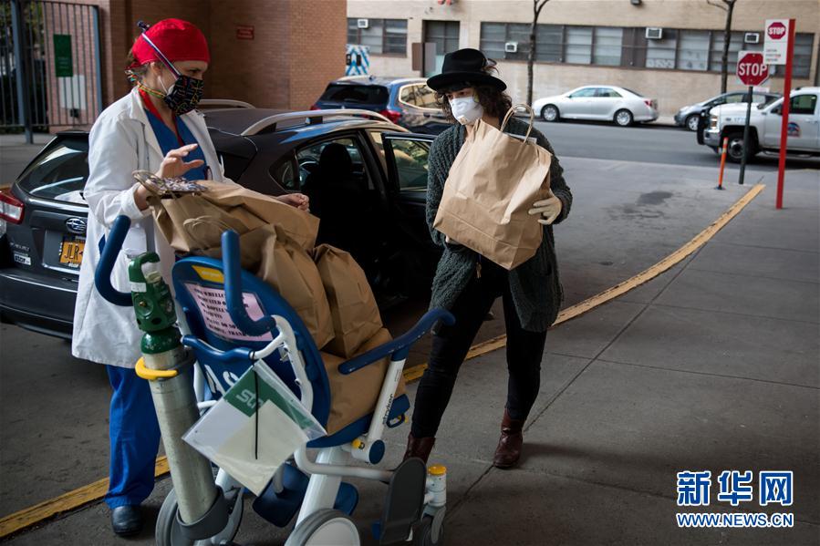 4月16日,在美国纽约一家医院外,餐厅老板(右)将捐赠的晚餐送给医务人员。 新华社发(郭克摄)