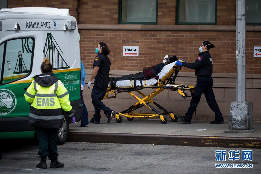 4月19日,在美国纽约,医护人员将病人送至一家医院。 新华社发(郭克摄)