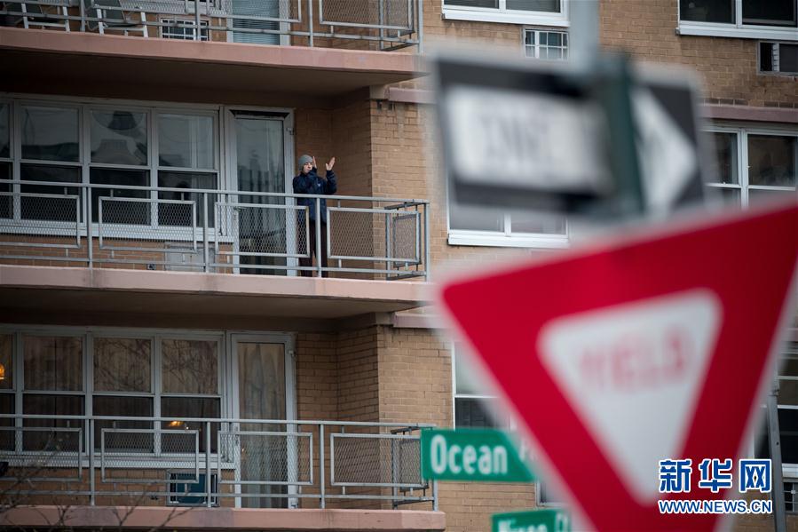 4月19日,在美国纽约科尼岛一家医院附近的居民楼上,一名居民为医护人员鼓掌。 新华社发(郭克摄)