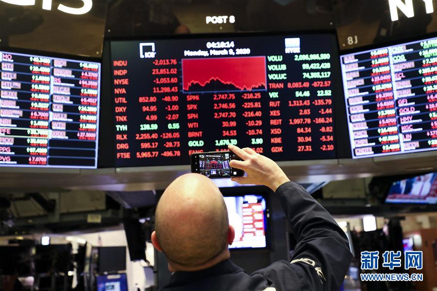3月9日,在美国纽约证券交易所,一名交易员收盘后拍摄显示当天交易情况的电子屏。当日,纽约股市开盘出现暴跌,随后跌幅达到7%上限,触发熔断机制。 新华社记者王迎摄