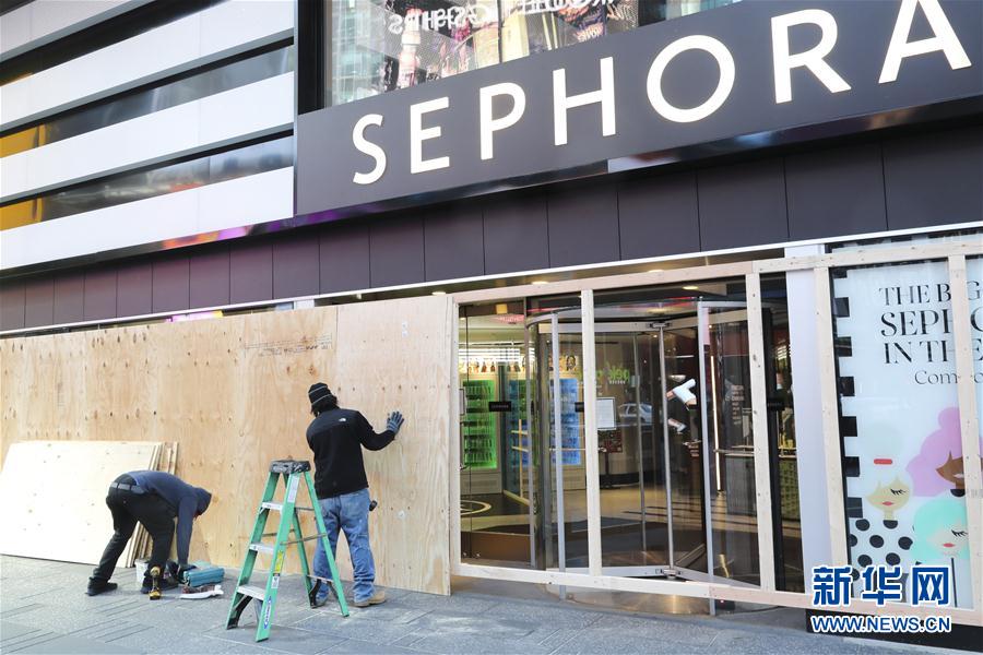 3月21日,在美国纽约时报广场,工人用木板封闭一家化妆品店。 新华社记者王迎摄