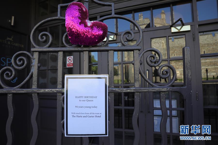4月21日,英国温莎城堡对面的一家酒店外张贴着祝福女王生日快乐的纸条。英国女王伊丽莎白二世及其丈夫菲利普亲王3月离开白金汉宫前往温莎城堡居住。新华社发(蒂姆·爱尔兰摄)