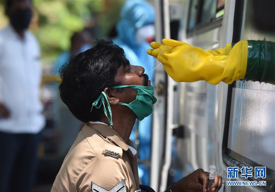 4月22日,在印度金奈,一名警察接受新冠病毒检测采样。 新华社发