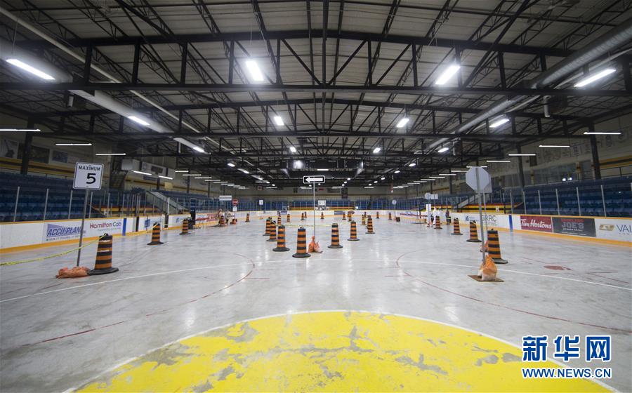 这是4月23日在加拿大哈密尔顿拍摄的一个由冰球馆改成的“不下车”新冠病毒检测站内景。 截至当日下午,加拿大累计新冠确诊病例升至41752例,累计死亡病例2141例。 新华社发(邹峥摄)