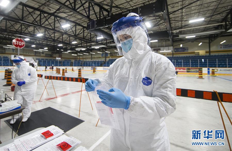 4月23日,在加拿大哈密尔顿一个由冰球馆改成的“不下车”新冠病毒检测站,一名工作人员准备检测材料。 截至当日下午,加拿大累计新冠确诊病例升至41752例,累计死亡病例2141例。 新华社发(邹峥摄)
