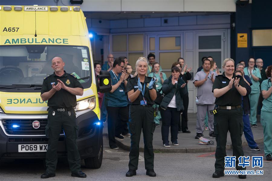4月23日,在英国利物浦,皇家利物浦大学医院的医护人员在医院外鼓掌。 新冠疫情爆发以来,每周四晚八时,英国人在阳台、门前或窗前鼓掌,向医护人员致敬。部分医院的医护人员也忙里偷闲走出医院,感谢人们的支持,也为自己鼓掌加油。 新华社发(乔恩·休珀摄)