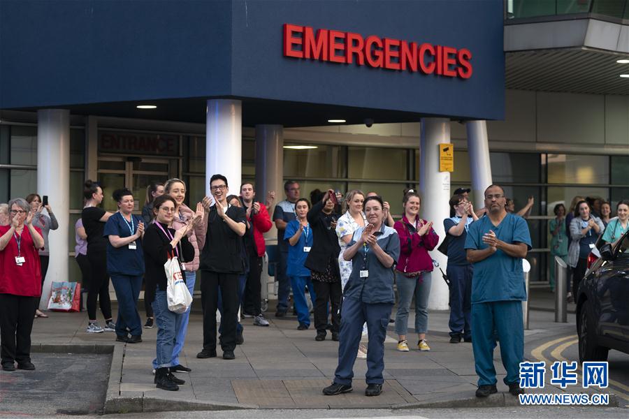 4月23日,在英国利物浦,皇家利物浦大学医院的医护人员在医院外鼓掌。 新冠疫情爆发以来,每周四晚八时,英国人在阳台、门前或窗前鼓掌,向医护人员致敬。部分医院的医护人员也忙里偷闲走出医院,感谢人们的支持,也为自己鼓掌加油。 新华社发(乔恩·休珀摄)