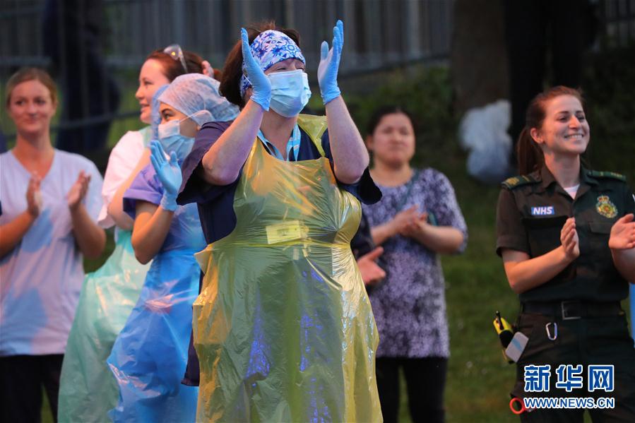 4月23日,在英国雷丁,皇家伯克郡医院的医护人员在医院外鼓掌。 新冠疫情爆发以来,每周四晚八时,英国人在阳台、门前或窗前鼓掌,向医护人员致敬。部分医院的医护人员也忙里偷闲走出医院,感谢人们的支持,也为自己鼓掌加油。 新华社发(蒂姆·爱尔兰摄)